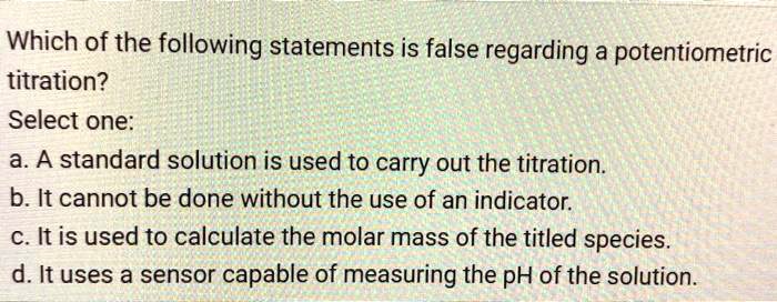 Solved Which Of The Following Statements Is False Regarding A Potentiometric Titration Select One A Standard Solution Is Used To Carry Out The Titration B It Cannot Be Done Without The Use Of
