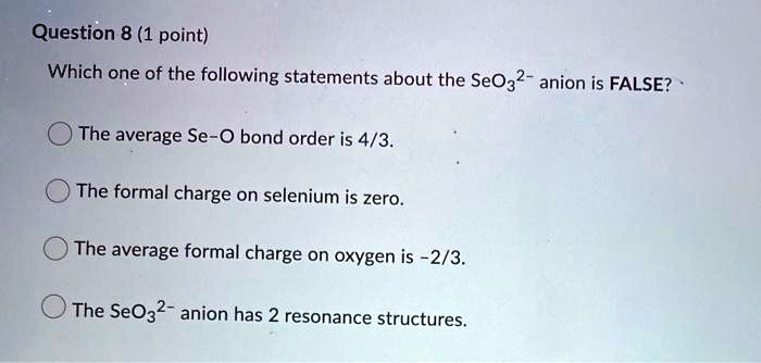 Solved Question 8 1 Point Which One Of The Following Statements About The Seo3 Anion Is False The Average Se 0 Bond Order Is 4 3 The Formal Charge On Selenium Is Zero The Average