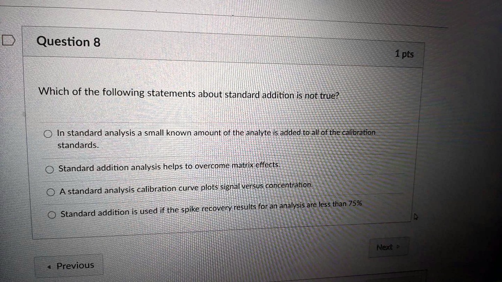 Solved Question 8 1pts Which Of The Following Statements About Standard Addition Is Not True In Standard Analysis A Small Known Amount Of The Analyte Is Added To All Of The Calibration Standards