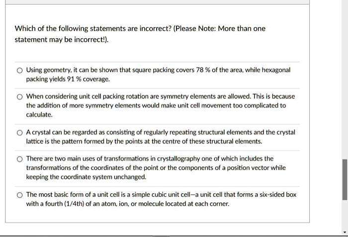 Solved Which Of The Following Statements Are Incorrect Please Note More Than One Statement May Be Incorrectl Using Geometry It Can Be Shown That Square Packing Covers 78 Of The Area While
