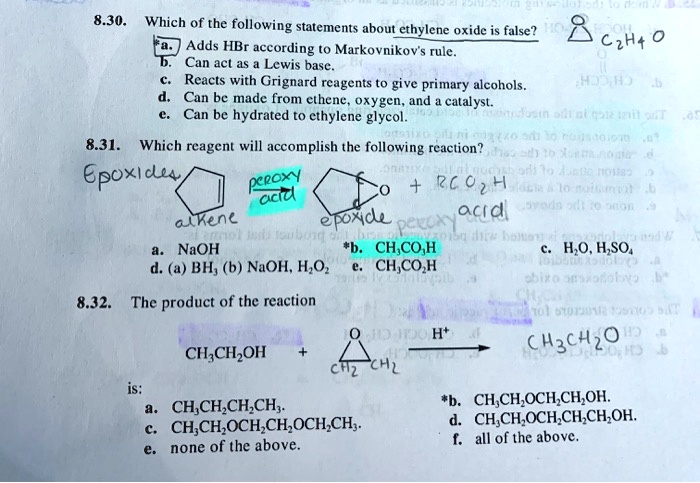 Solved 8 30 Which Of The Following Statements About Ethylene Oxide Is False Adds Hbr Czht0 According T0 Markovnikovs Rule Can Act As Lewis Base Reacts With Grignard Reagents To Give Primary Alcohols 4