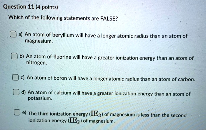Solved Question 11 4 Points Which Of The Following Statements Are False A An Atom Of Beryllium Will Have A Longer Atomic Radius Than An Atom Of Magnesium B An Atom Of Fluorine