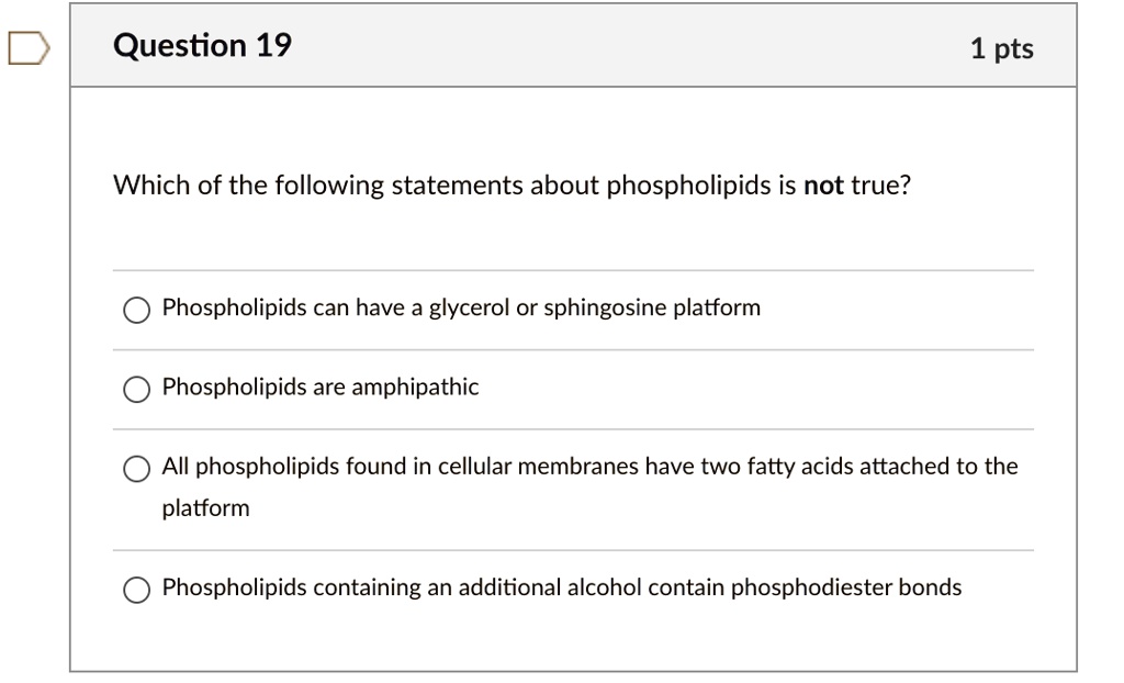 Solved Question 19 1 Pts Which Of The Following Statements About Phospholipids Is Not True Phospholipids Can Have A Glycerol Or Sphingosine Platform Phospholipids Are Amphipathic All Phospholipids Found In Cellular Membranes Have