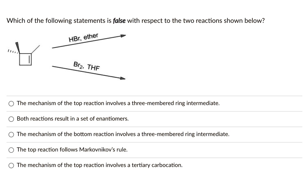 Solved Which Of The Following Statements Is False With Respect To The Two Reactions Shown Below Hbr Ether Br2 Thf The Mechanism Of The Top Reaction Involves A Three Membered Ring Intermediate Both Reactions